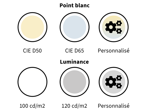 Créez facilement des profils personnalisés pour vos écrans à l’aide d’un préréglage, puis personnalisez le point blanc et la luminance. Créez rapidement vos paramètres idéaux et accédez à un monde de couleurs parfaitement optimisées sur vos écrans.
